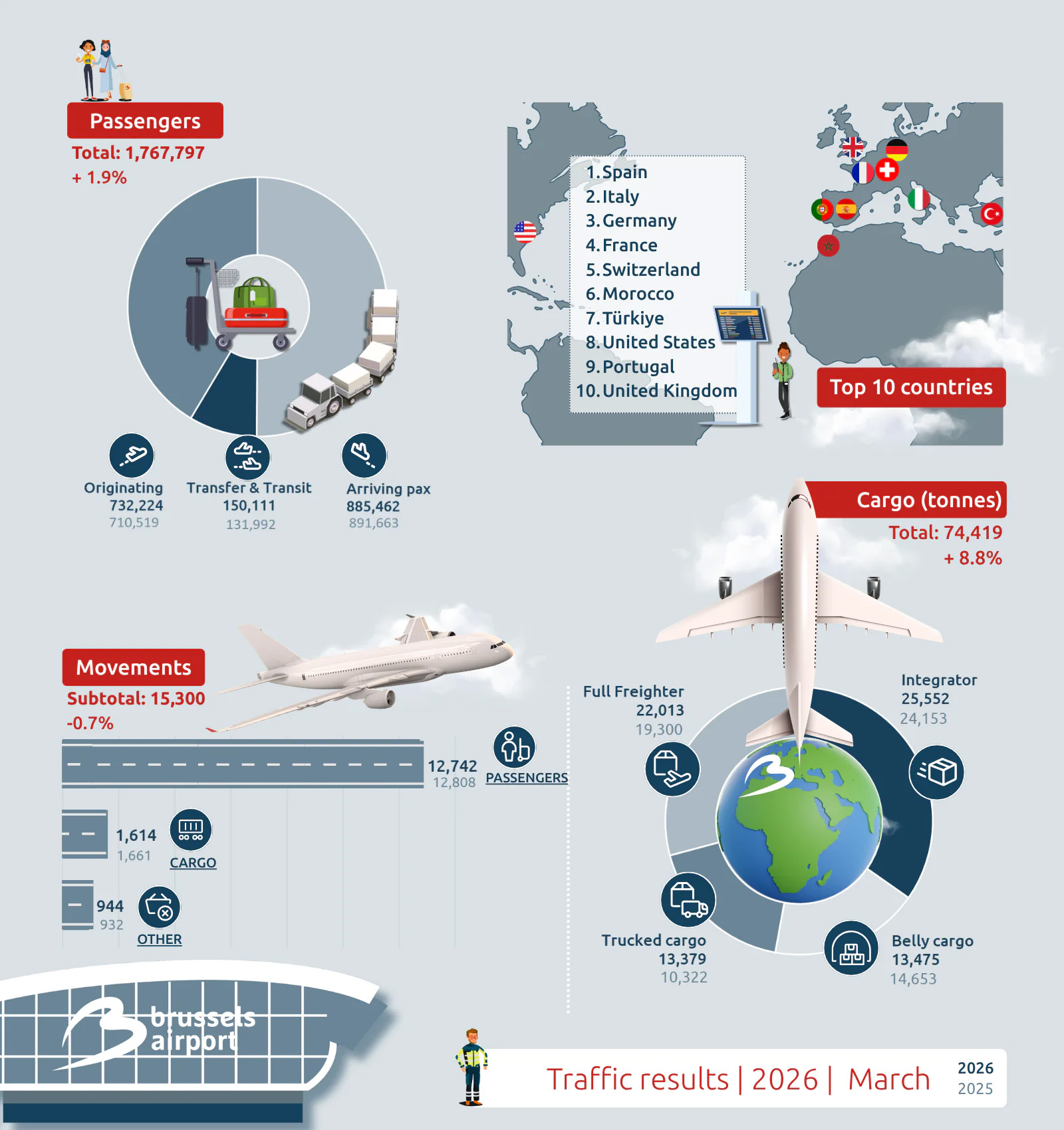 1,767,797 passengers travelled through brussels Airport in March, a 1.9% increase despite the negative impact of the Middle East conflict and the national strike day on 12 March. Cargo volumes grew by 8.8% to a total of 75,000 tonnes.